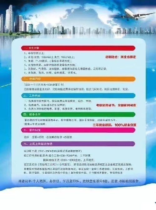 本公司与各大航空服务公司联合开办、面向全国择优录取学员,经专业技能强化实训,直接输送到北京各大航空服务公司从事航空票务相关工作。
