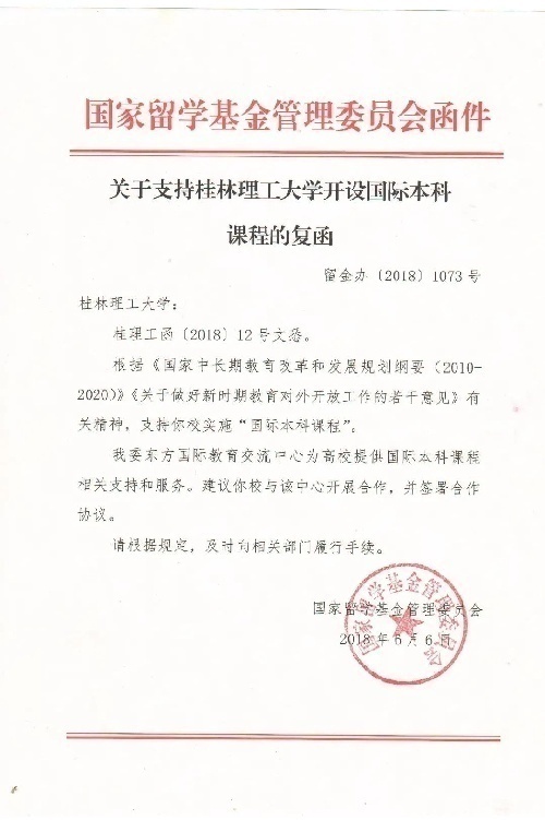 2018年6月份国家留学基金管理委员会批复同意桂林理工大学开办“国际本科课程”,并提供全方位的教学服务与优质的国际教育资源。