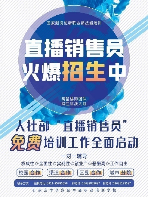 石家庄市人力资源和社会保障局定点职业技能培训机构及定点创业培训机构。我校创建于2019年初,学校地处石家庄市。具有多媒体教学设施以及教学实训机房,课程涉及方向有:计算机软件、通信工程、大数据、直播销售等。现拥有专业和兼职教师十余人。