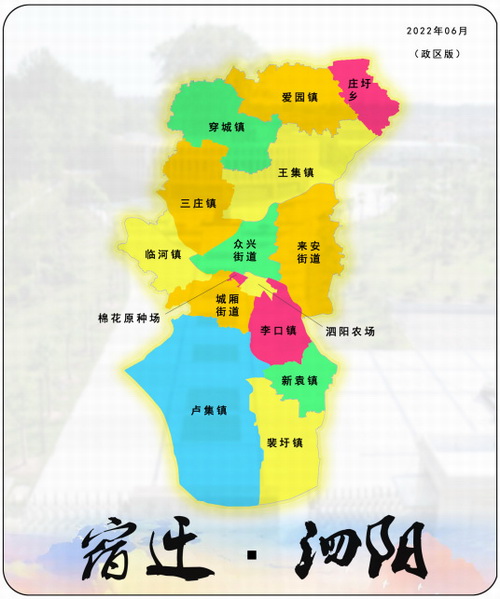 泗阳县,古称淮阳、桃源,位于江苏省北部,东临周恩来总理故乡淮安市,西接项羽故里宿迁市,南濒全国第四大淡水湖洪泽湖,京杭大运河、徐盐高速、新长铁路、宿淮铁路穿境而过,属长三角经济区和淮海经济区,县域面积1418平方公里,总人口106.3万,辖10个乡镇、3个街道、1个省级经济开发区。县政府驻众兴街道。根据全国第七次人口普查数据显示,截至2020年11月1日零时,泗阳县常住人口为829562人。
