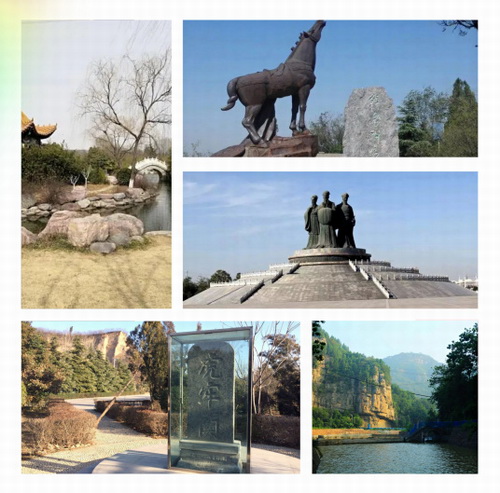 (概述图依左至右依次为:刘禹锡墓、汉霸二王城、三公像、虎牢关、环翠峪)