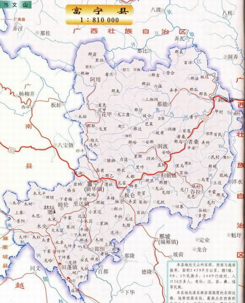 富宁县为中国云南省文山州下辖县。民国时期设富宁县,系因元时曾于此置过安宁州,后又将安宁州并入富州,故名。富宁县位于云南省东南部,南与越南河江省接壤,东部和北部分别与广西百色右江、西林、田林、那坡、靖西五县(区)毗邻,西与文山州的广南、麻栗坡两县相连,地处两国三省十县结合部,国道323线贯穿县境,是云南通往广西、广东等沿海地区的重要门户。辖6镇7乡141个行政村、3个社区、1个居委会、2577个村民小组。全县国土面积5352平方公里。根据第七次人口普查数据,截至2020年11月1日零时,富宁县常住人口为396818人。