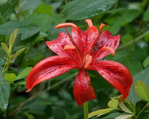 山丹(拉丁学名:Lilium pumilum DC.)是百合科、百合属植物。鳞茎卵形或圆锥形,高2.5-4.5厘米,直径2-3厘米;鳞片矩圆形或长卵形,长2-3.5厘米,宽1-1.5厘米,白色。茎高15-60厘米,有小乳头状突起。花单生或数朵排成总状花序,鲜红色,通常无斑点;花被片反卷,长4-4.5厘米,宽0.8-1.1厘米;花丝长1.2-2.5厘米,无毛,花药长椭圆形,长约1厘米;子房圆柱形,长0.8-1厘米;花柱稍长于子房或长1倍多。蒴果矩圆形,长2厘米,宽1.2-1.8厘米。花期7-8月,果期9-10月。
