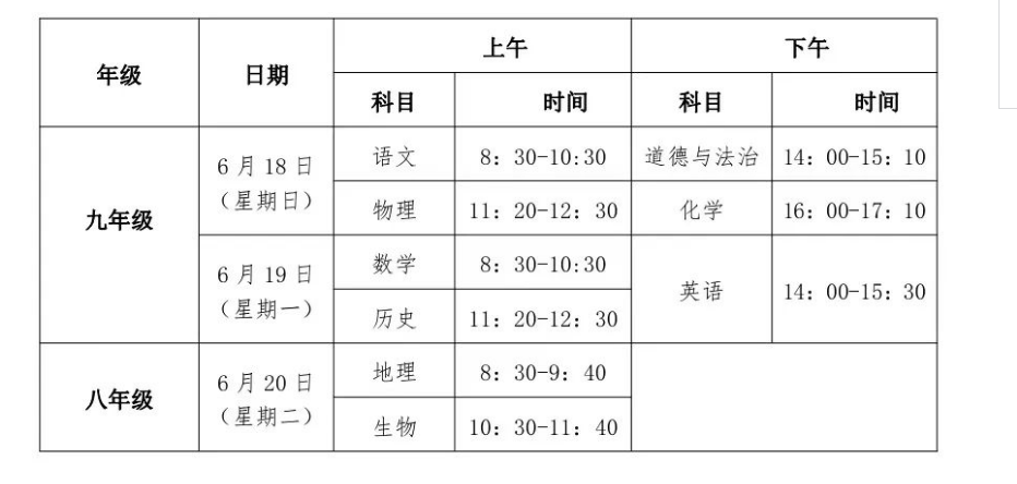 (1)时量:语文、数学为120分钟;英语为90分钟;道德与法治、物理、化学、历史、生物、地理为70分钟;体育、英语口语考试及艺术、物理实验操作、化学实验操作、生物实验操作、信息技术上机操作考查根据各学科特点另行安排。