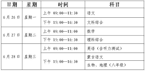 根据巴彦淖尔市教育的《2023年内蒙古巴彦淖尔市中考方案确定》中得知,2023年内蒙古巴彦淖尔中考时间:6月26日-28日,相关事宜如下: