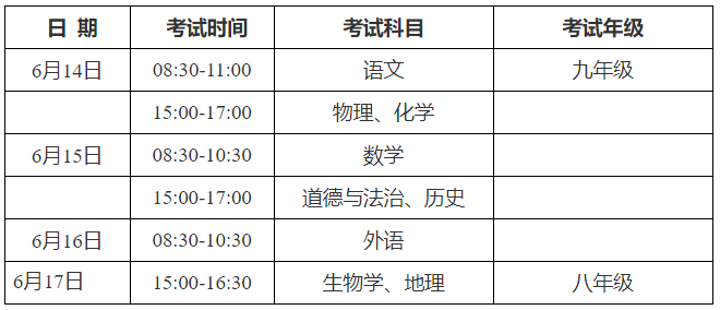 从安徽省教育厅发布的《安徽2023年初中学业水平考试工作的通知》得知,2023年安徽亳州中考时间、科目及分值数已公布,九年级6月14日-16日举行考试,八年级6月17日举行考试,具体详情如下:
