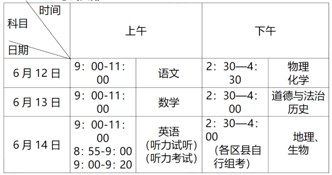 据悉,重庆合川中考时间2023年具体时间已公布,安排在6月12日-14日期间举行。重庆合川中考总分为750分,共9个科目。具体如下: