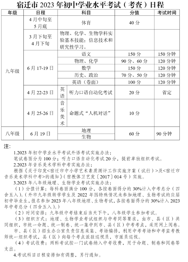 语文、数学、外语、物理、化学、历史、政治及八年级地理、生物闭卷考试;外语听力口语自动化考试按省教育厅有关文件精神执行,体育考试方案另发,音乐与美术考试方案根据《关于印发<宿迁市中小学艺术素质测评工作实施方案(试行)>及<宿迁市音乐美术学科中考>的通知》(宿教体卫艺发〔2017〕014号)执行。语文考试时间为150分钟,数学考试时间为120分钟,外语(笔试)考试时间为120分钟,物理与化学同场考试,考试时间120分钟,历史与政治同场考试,考试时间120分钟;八年级地理与生物同场考试,考试时间90分钟。