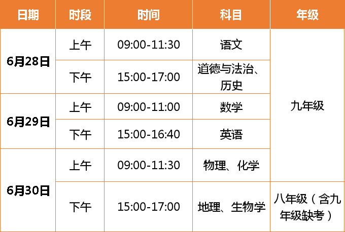 4月5日,自治区教育厅下发《关于做好2023年初中学业水平考试工作的通知》,明确全区统一组织的考试在6月28日至30日进行,英语听力口语测试、信息技术、体育与健康、物理化学生物学实验操作(含八年级)、音乐美术书法综合实践、综合素质评价等科目考试由市、县(区)自行组织,原则上在5月底前全部完成。