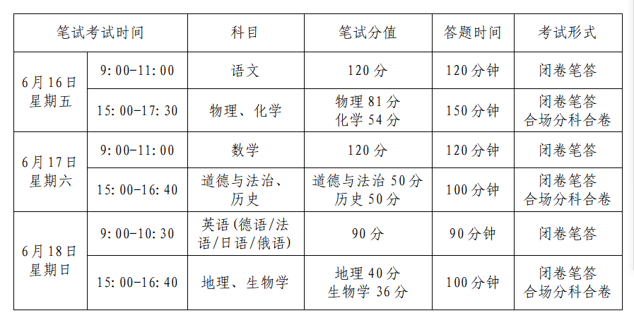 统一考试科目包括语文、数学、外语、道德与法治、历史、物理、化学、地理、生物学、体育与健康,共10科。各科目满分分值为:语文、数学、外语各120分,物理90分,化学60分,道德与法治、历史各50分,地理、生物学各40分,体育与健康50分,总分满分740分。其中外语分值中包含30分的听力、口语考试分值,物理、化学、生物学的分值中各包含10%的实验操作考试分值。