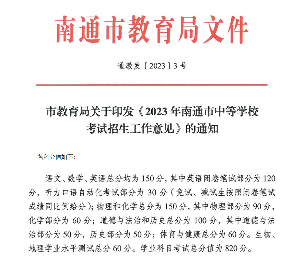 从南通市教育局获悉,2023年江苏南通中考时间为6月16、17、18日,2023年南通中考总分820分,共有地理、生物、语文、数学,英语、物理、化学、历史、政治、体育九门科目,具体详情如下: