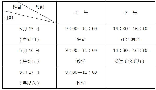 1.考试科目:语文、数学、英语(含听力)、科学、历史与社会·道德与法治(简称社会·法治,下同)共五门。