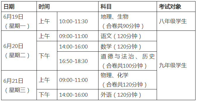 考试科目为:语文、数学、外语、物理、化学、生物、道德与法治、历史、地理、体育与健康、音乐、美术、综合实践活动(信息技术教育)、生命安全教育、心理健康教育。
