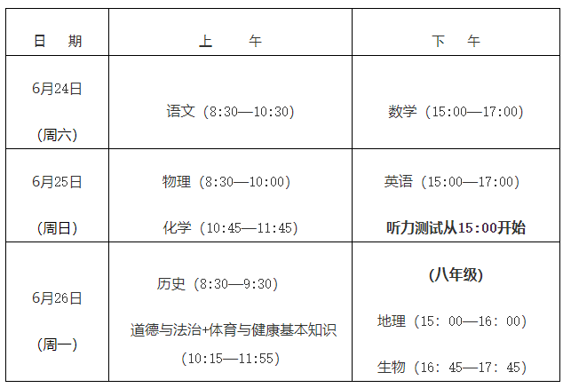 根据三明市教育局公布的《2023年福建三明市初中毕业和升学考试办法》据悉,福建三明中考时间2023年具体时间及科目安排已公布,安排在6月24日至6月26日期间。具体如下: