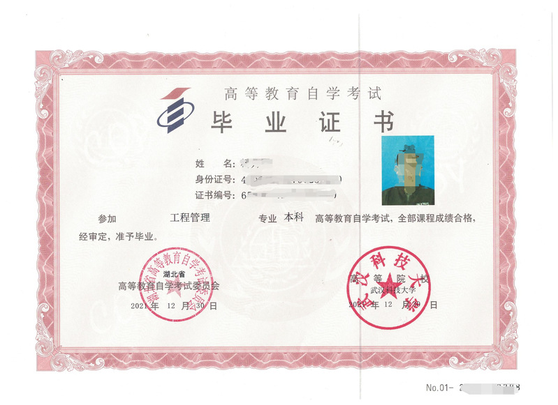 (二)毕业证书。由湖北省高等教育自学考试委员会颁发,主考学校副署,国家承认学历,学信网可查。