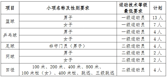 (五)计划调整办法:若某一项目第二志愿最低录取控制线上生源不足时,则将该项目剩余计划调整到其他项目。调整顺序为篮球(男子)→篮球(女子)→乒乓球(男子)→乒乓球(女子)→足球→田径→网球(男子)→网球(女子),每轮每个项目依次增加1个计划,直至剩余计划全部分配完成,若所有项目均无符合录取要求的二志愿生源,则不再调整。二志愿通过计划调整录取的考生,综合分不低于一志愿该项目最低综合分(计划调入的项目,一志愿上线考生已被全部录取的情况除外)。