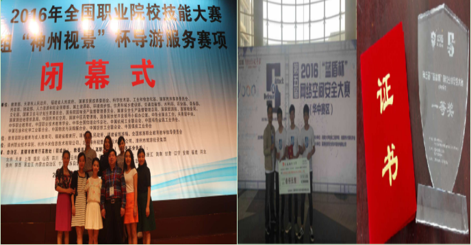 2016年5月,李金兰、罗靓同学代表湖南省参加在福建漳州举行的全国职业院校技能大赛,荣获中文“导游服务”和英语“导游服务”一等奖和二等奖,为湖南省和我院历史最好成绩,省教育厅主要领导发来贺电。    2016年5月,李明、胡翔勇、龚小杰同学代表湖南省参加在天津举行的全国职业院校技能大赛,荣获“信息安全管理与评估”三等奖。    2016年5月,我院荣获“2016年湖南省职业院校技能竞赛”高职组团体三等奖,我院代表团的获奖成绩位于全省67所高职院校前10名。    2016年5月,我院信息安全工作室学生成员龚小杰、苏建斌、谭奕杰同学荣获“蓝盾杯”华中赛区一等奖,将于11月份代表华中赛区参加在广州中山大学举办的全国网络空间安全决赛。    2016年5月,我院荣获省教育厅、省军区联合颁发的“2015年全省学生军训工作先进单位”奖牌。