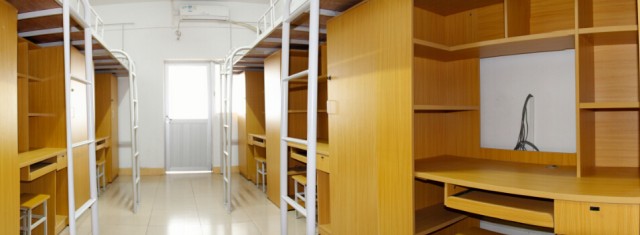 学院生活条件舒适便利,6人学生公寓标准配置:空调、宽带、独立卫生间、冲凉房、衣柜、电脑台、写字台、太阳能热水和直饮水等设施一应俱全。