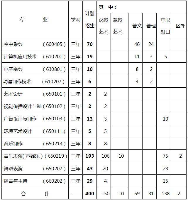 1、音乐表演(器乐)(马头琴、四胡、古新筝、钢琴、手风琴、电子琴 [ 双排键 ]、小提琴【含电子小提琴】、大提琴、长笛、单簧管、大管、萨克斯、小号、长号、竹笛、二胡、扬琴、三弦、琵琶、打击乐、吉他、钢琴调律等);2、音乐表演(声乐)(美声唱法、民族唱法、通俗唱法、蒙古族通俗唱法、蒙古族长调、蒙古族短调等);3、舞蹈表演;4、艺术设计;5、视觉传播设计与制作(原装潢艺术设计);6、广告设计与制作;7、动漫制作技术;8、环境艺术设计(原雕塑艺术设计);9、播音与主持;10、音乐制作(原计算机音乐制作);11、计算机应用技术(计算机网络技术、多媒体技术、图形图像技术);12、空中乘务;13、电子商务。