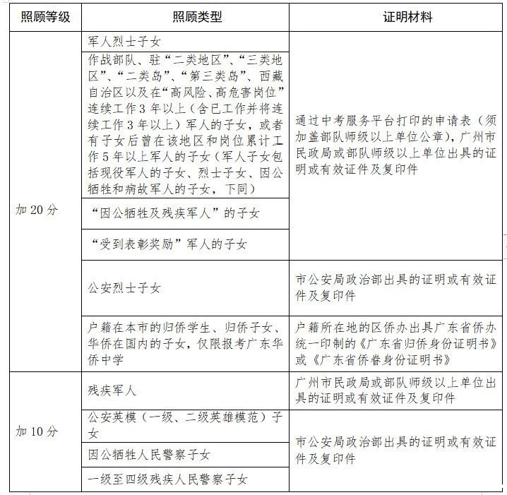 军人烈士子女作战部队因公牺牲及残疾军人子女,受到表彰奖励的军人子女,公安烈士子女,户籍在本市的华侨学生,归侨子女,华侨在国内的子女等都可享20分的加分;残疾军人,公安英模,因公牺牲人民警察子女,一级至四级残疾人民警察子女可享10分加分。