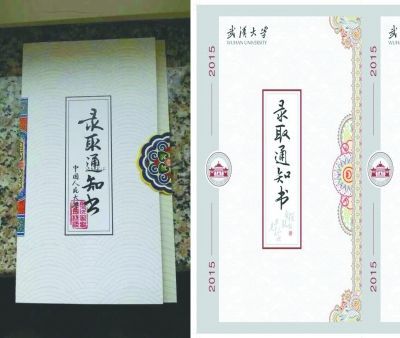 前日,武汉大学官微公布了该校今年录取通知书的图片,并称“今年通知书下方草书的八字校训伴有传统花纹,颇有一番韵味”。不久就有网友发帖指出,该录取通知书和中国人民大学2014年版录取通知书在风格、样式上非常相似,皆是采用“新古典”竖式排版,题签+毛笔字体,并配以传统花纹。随后,还引发了两校学子在网上激烈争论。