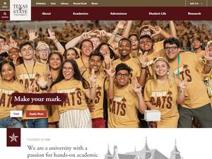 德克萨斯州立大学成立于1899年,是一所非营利性公立高等教育机构,位于德克萨斯州圣马科斯市(人口范围为50000-249999人)郊区。该学院还在圆岩设有分校。德克萨斯州立大学(TXST)是一所规模非常大(uniRank招生范围:40000-44999名学生)的男女同校美国高等教育机构,由南方学院协会学院委员会正式认证。德克萨斯州立大学(TXST)提供课程和项目,以获得官方认可的高等教育学位,如若干研究领域的学士学位、硕士学位、博士学位。有关更多详细信息,请参见下面的uniRank学位等级和学习领域矩阵。这所拥有121年历史的美国高等教育机构根据入学考试和学生过去的学习成绩和成绩实行选择性录取政策。入学率在40-50%之间,这使得这家美国高等教育机构成为一所普通的选择性院校。欢迎国际学生申请入学。TXST还为学生提供若干学术和非学术设施和服务,包括图书馆、住房、体育设施、经济援助和/或奖学金、出国留学和交流计划、在线课程和远程学习机会,以及行政服务。