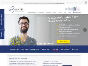 威腾/黑德克大学(Witten/Herdecke University)成立于1982年,是一所非营利性私立高等教育机构,位于北莱茵-威斯特伐利亚州小城市威腾(人口50,000-249,999居民)的城市环境中。该机构还在以下地点设有分校:多特蒙德,波鸿。威腾/赫尔德克大学(UW/H)是由北莱茵-威斯特法伦州文化和科学部(北莱茵-威斯特法伦州文化和科学部)正式承认的一所小的(伊朗排名范围:2000 - 2999名学生)男女同校的德国高等教育机构。威腾/赫德克大学(UW/H)提供官方认可的高等教育学位的课程和项目,如学士前学位(即证书、文凭、副学士或基础学位)、学士学位、硕士学位、几个研究领域的博士学位。详情请参阅下面的uniRank学位水平和学习领域矩阵。这所拥有38年历史的德国高等教育机构有一个基于入学考试和学生过去的学习成绩和成绩的选择性录取政策。录取率在70-80%之间,这使得这所德国高等教育机构在某种程度上成为选择性的机构。欢迎国际学生申请入学。华盛顿大学还为学生提供一些学术和非学术设施和服务,包括图书馆、体育设施、财政援助和/或奖学金、海外学习和交换项目,以及行政服务。