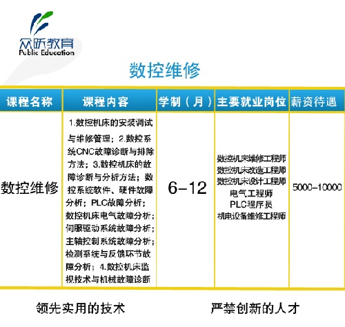 数控机床维修专业(包括安装、调试、改造、维修),数控机床是一种自动化程度较高,结构较复杂的先进加工设备,是一种典型的机电一体化产品,能够实现高速、高精度和高自动化。在企业生产中占有重要地位,如果做好数控机床的维修,使其发挥应用的效益。直接关系到企业的经济效益。而作为现代PLC机床及CNC机床的专业医生,数控维修人员在社会上具有较高的社会地位,同时可以拥有较高的收入。
