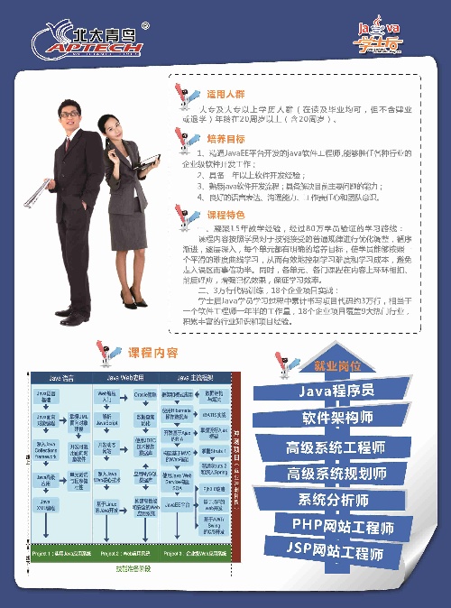 北大青鸟学士后网络营销师课程是北大青鸟专门针对大学生和在职、待业人群精心设计、打造的高端教育培训产品之一,由来自北大青鸟职业教育研究院的专业技术开发团队开发完成,也是全国首套成体系、系统讲解网络营销的专业课程,课程共分4个模块,学习周期为6个月左右,全程项目实战,累计多达40余个真实典型项目,帮助学生积累项目经验。学员通过考试后可获得北大青鸟颁发的“网络营销师证书”、“电子商务师证书”、国家劳动和社会保障部颁发的“高级网络营销师专家认证证书”以及百度营销大学颁发的结业证书。