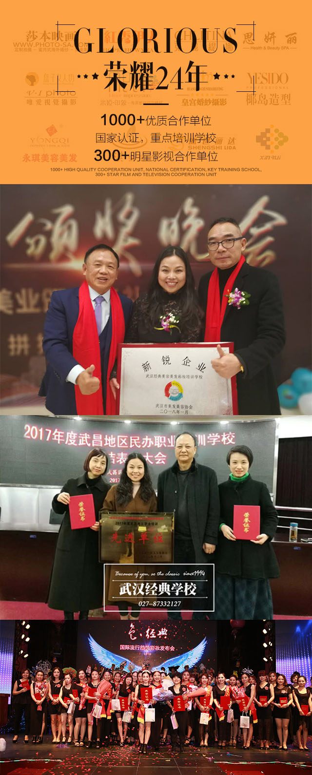 在多年高品质办学和坚持不懈的创新下,得到了时尚界和美业的高度关注和认可,多次受邀参加国内外影响较大的时尚活动:2008年上海国际车模展、2009武汉选美大赛、第57届世界选美大赛、CCTV电视模特大赛、中国国际时装周、2011世界环球大赛、2012中国万达"王的盛宴"、2013幸福武汉十月婚典,2015“色.经典”荣获最高奖、2016年度经典学校被评为优秀学校、刘籽君校长被评为优秀教育工作者,及优秀教学团队、2017年度经典学校再次被评为“优秀学校”,“优秀教学团队”,刘籽君校长被评为“优秀校长”、在2017年武汉市职业技能大赛,共三个一等奖,经典学校斩获两个一等奖,三个二等奖、2018年武汉美业协会颁奖晚会,被授予《新锐企业》最高荣誉等。同时经典学员在国内重大的化妆美容美发专业赛事中也取得了骄人的成绩:"全国首届"千艺千惠"杯化妆造型新娘妆组金奖"、 "全国美容文化节美甲大赛银奖"、" 全国美容文化节纹绣大赛亚军"等。