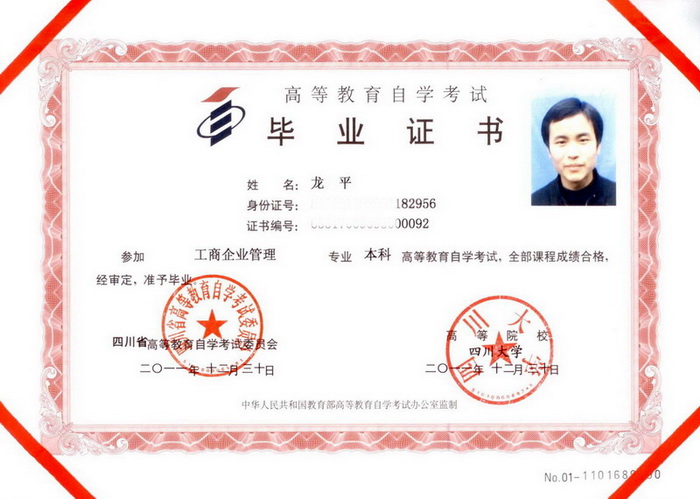 4、   川大本科自考文凭性质:属于国民教育系列的自考性质学历文凭,毕业证书经教育部电子注册,国家承认,全国通用,可考公务员或报考研究生。