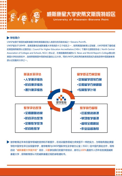 诞生于1894年,是美国著名的威斯康星大学系统的十三个校区之一,按照美国的教育认证制度,UWSP获得了最权威的美国高等教育认证委员会(Council for Higher Education Accreditation, CHEA)下属中北部院校协会(North Central Association of Colleges and Schools, NCA)的认证,在美国最具权威的U.S. News and World Report's College推出的美国大学综合排名中,连续荣登美国中西部地区最佳公立大学。同时UWSP以其优秀的教育资质成为首批获得中国国家教育部认证的数所大学之一。