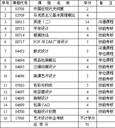 中国近代史纲要,马克思主义基本原理概论,英语(二),字体设计,插画技法,POP与DM广告设计,版式设计,商品包装概论,三维动画设计,装潢艺术设计,色彩与构成,纸容器设计,装帧设计,包装CAD,电脑设计创意,毕业考核(共16门课程)