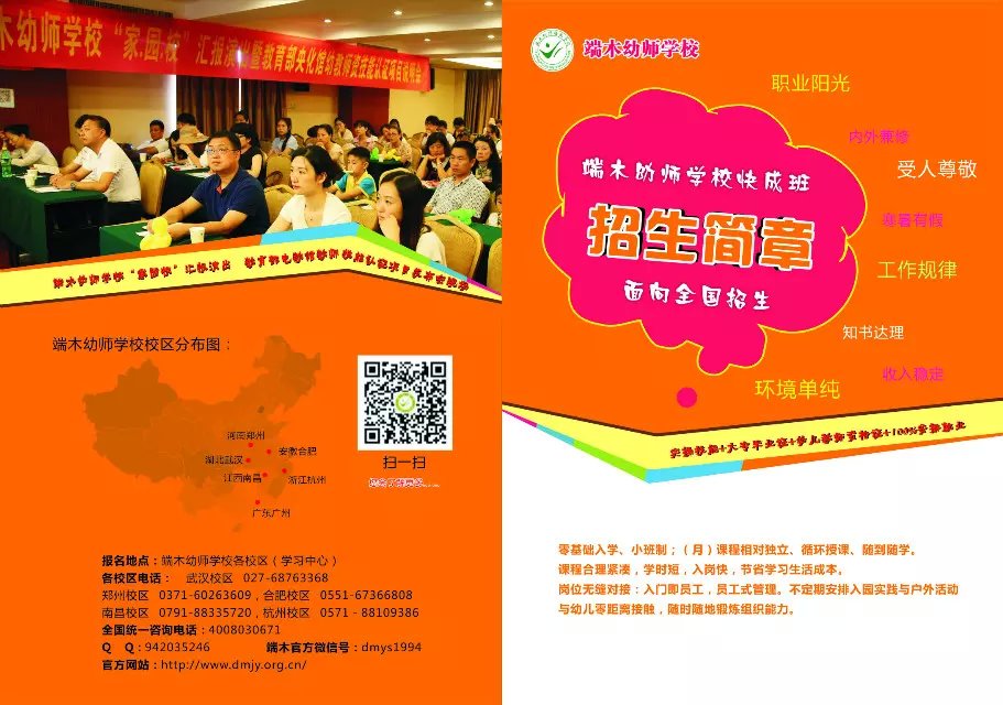 端木幼师是由武汉市端木美术职专和武汉市洪山区文海考研及艺术培训学校共同成立,是一所培训幼儿教师的专业学校。自2002年以来,通过不断发展,已拥有自己独立的教学方法、师资队伍和课程体系,并在湖北武汉、河南郑州、安徽合肥、江西南昌、浙江杭州、广东广州设立有幼儿特色教师培训基地。