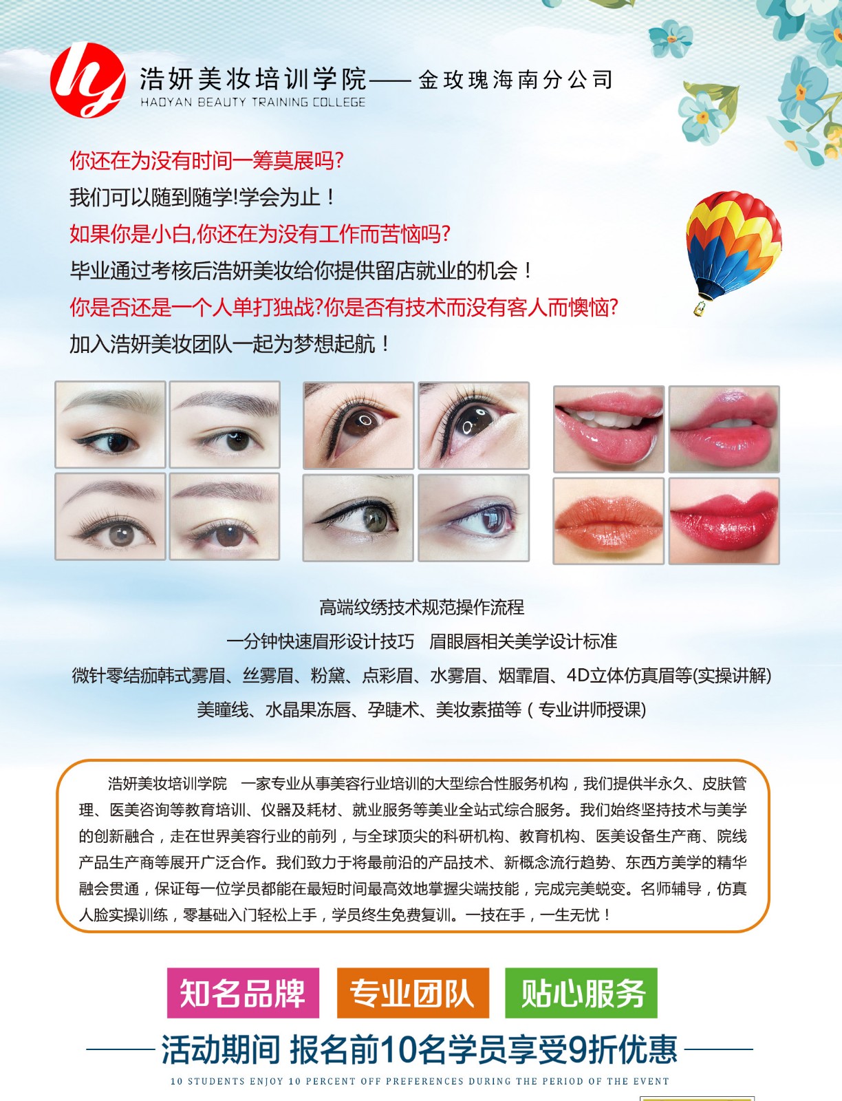海口浩妍美妆培训学院,一家专业从事美容行业培训的大型综合服务机构,我们提供纹绣,美甲,皮肤管理,医学咨询等教育培训,仪器及耗材,就业服务等美业全站式综合服务。我们始终坚持技术与美学的创新融合,走在世界美容行业的前列,与全球尖端的科研机构,教育机构,医美设备生产商,院线产品生产商等展开广泛合作。我们致力于将前沿的产品技术,新概念流行趋势,东西方美学的精华融会贯通,保证每一位学员都能在短时间有效地掌握尖端技能,完成完美蜕变。名师辅导,软皮人脸实操训练,零基础入门轻松上手,学员终生免费复训。一技在手,一生无忧!