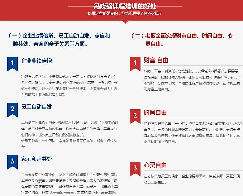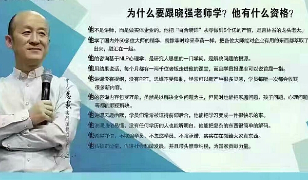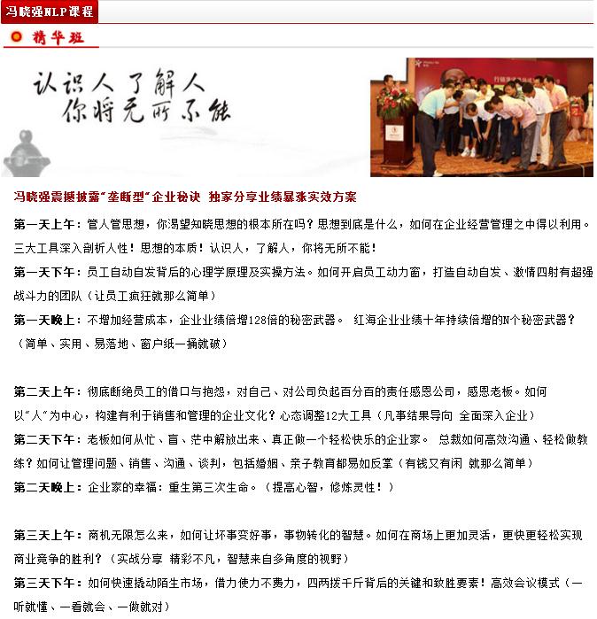 企业的管理问题、销售、沟通、谈判,包括婚姻、亲子都是有关人的问题。认识人,了解人,你将无所不能!冯-晓-强老师,轻松、简单、自然、用极其深入浅出的方式,为你剖析关于人的大智慧!冯-晓-强NLP总裁商战课程基于心理学原理,结合企业实际问题与现实状况,从思想层面剖析种种问题的根源和本质,并结合自身的成功企业实战经验,彻底对企业家的大脑升级,最终实现企业与个人的快速成长和转型。