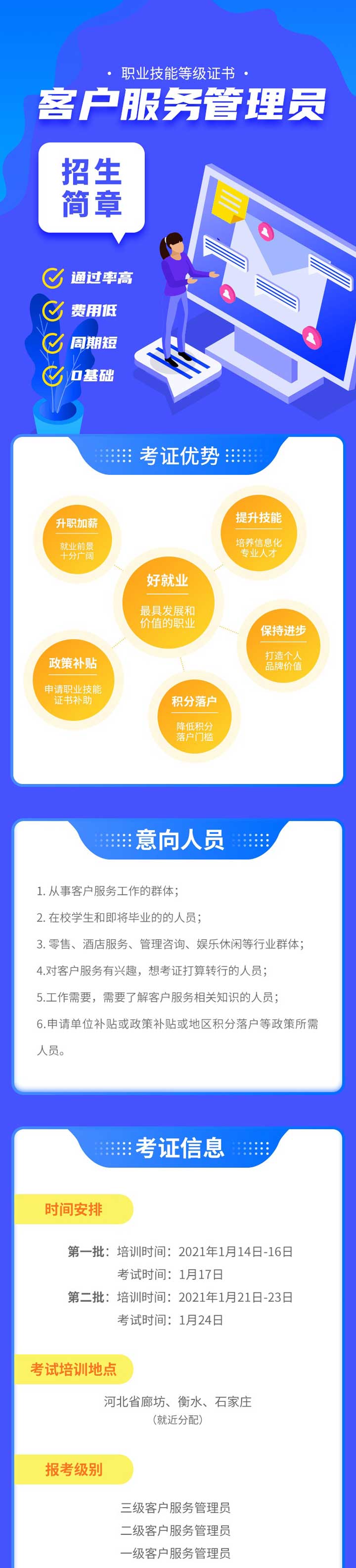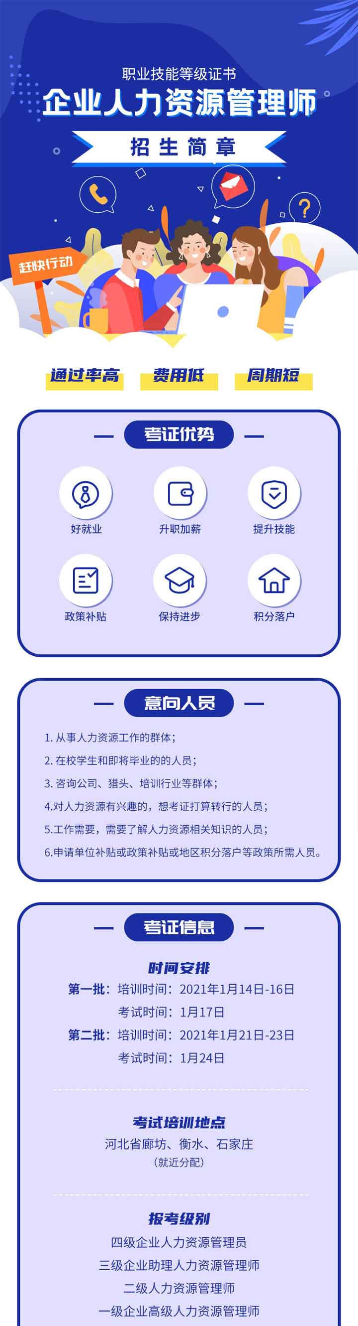 地方人社部备案,职业技能等级培训:企业人力资源管理师(共四个级别)和健康管理师(共三个级别)和客户服务管理员(共三个级别,38周岁以上的能直接考一级)于下月在河北省石家庄与廊坊和衡水三地同时线下开班,培训考试连续四天。现集团有26个职业技能等级工种,本集团从事职业技能等级培训16年,缴费开票,不过退款,助您提升薪资,降低天津积分落户门槛,常年开班,本月最后一批招生优惠多多!