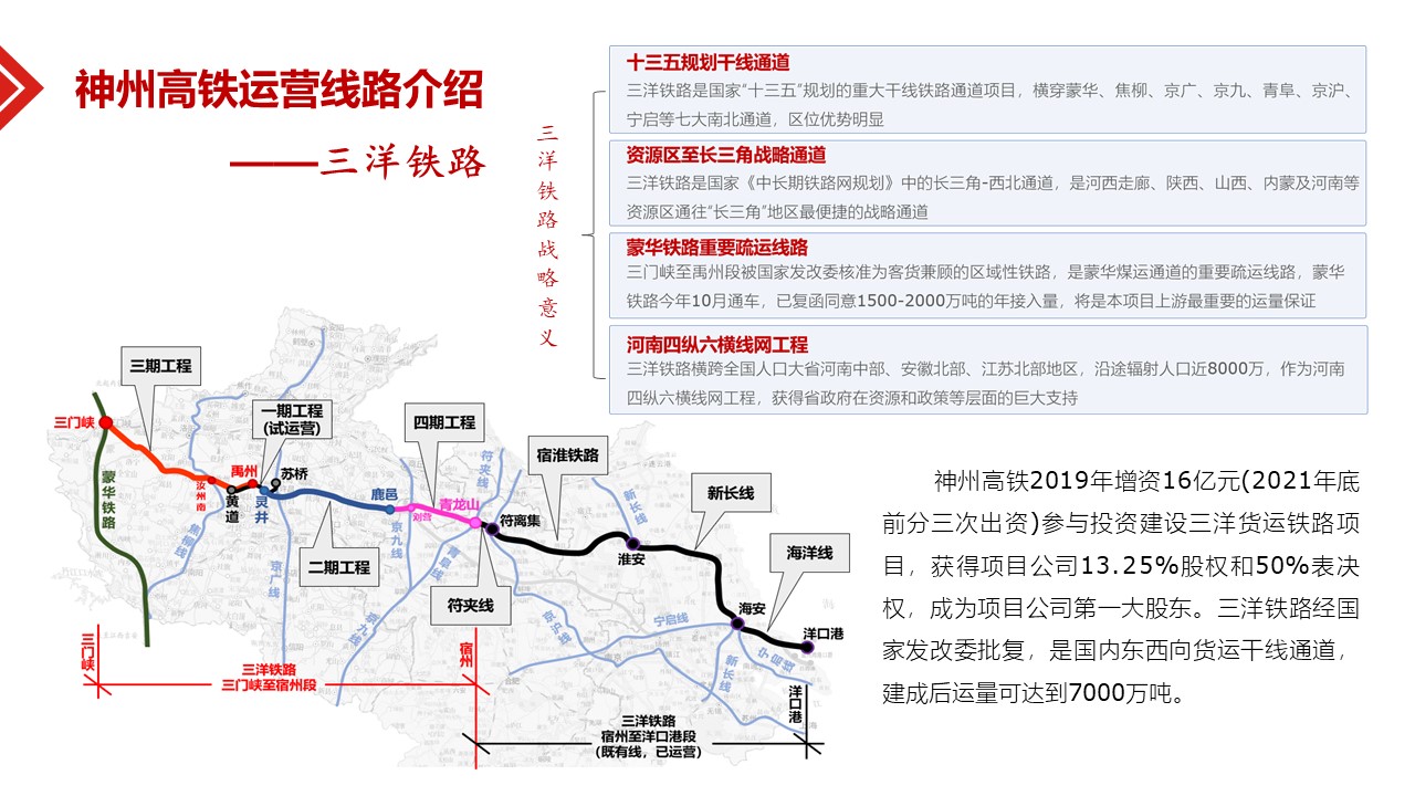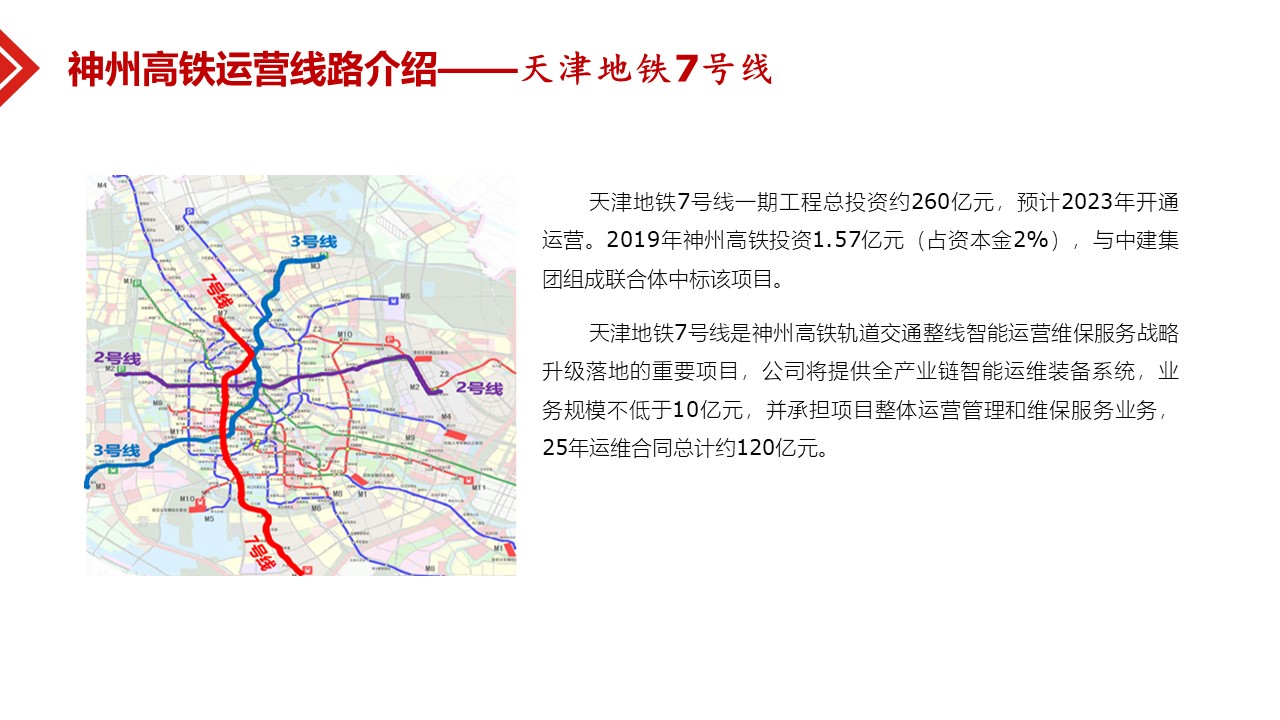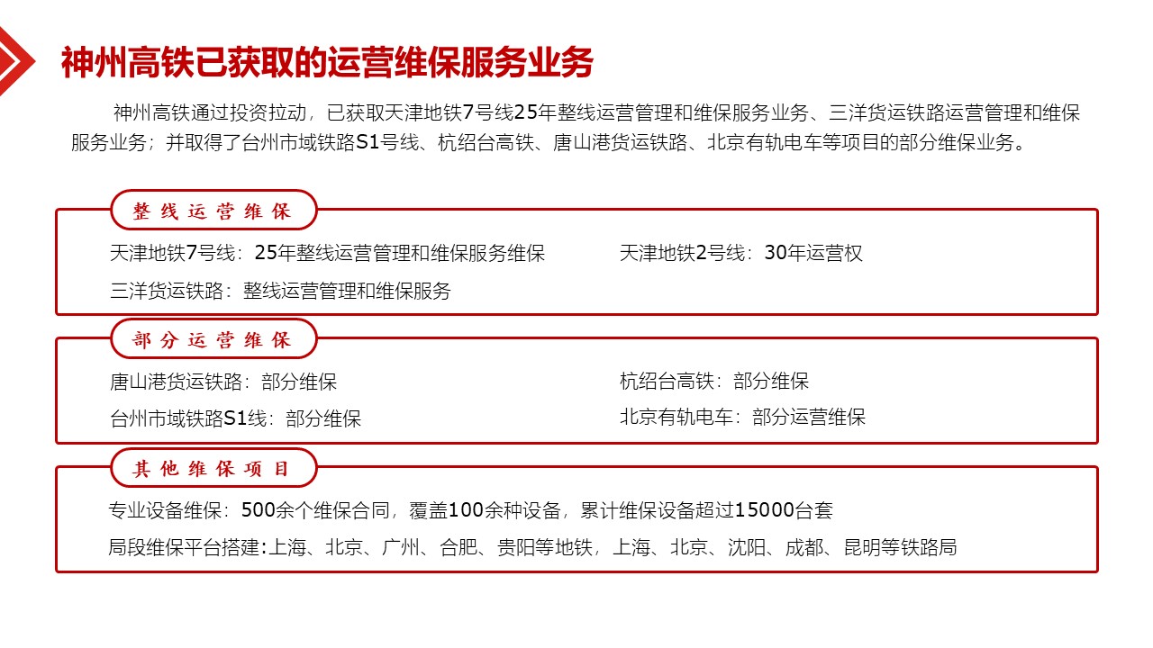 神州高铁投资建设并运营的三洋铁路项目全长664公里,设有54个车站,跨越河南、安徽两省;同时,神州高铁全面参与天津市区域地铁线路运营,未来将以京津冀区域为核心,重点开拓城市轨道交通智能运维业务。