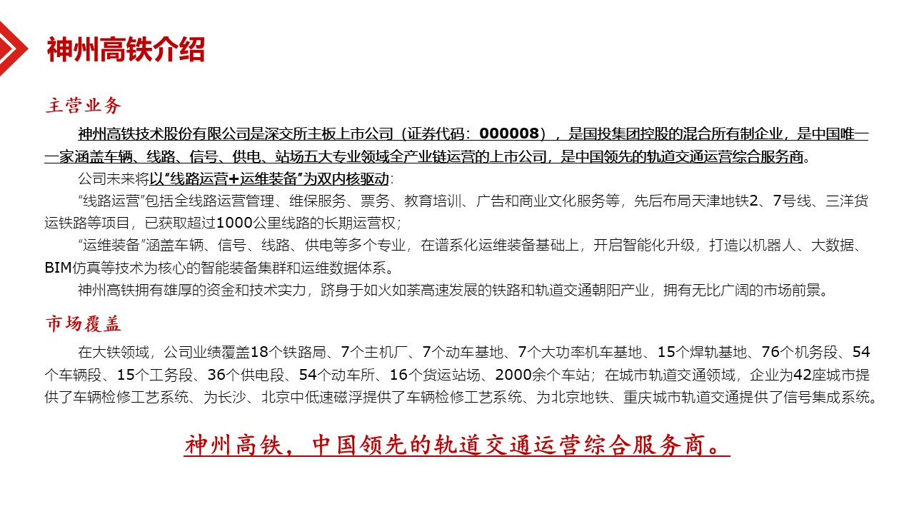 神州高铁技术股份有限公司(以下简称“神州高铁”)是中国唯一一家涵盖车辆、线路、信号、供电、站场五大专业领域全产业链运营的上市公司,是中国轨道交通运营综合服务商。