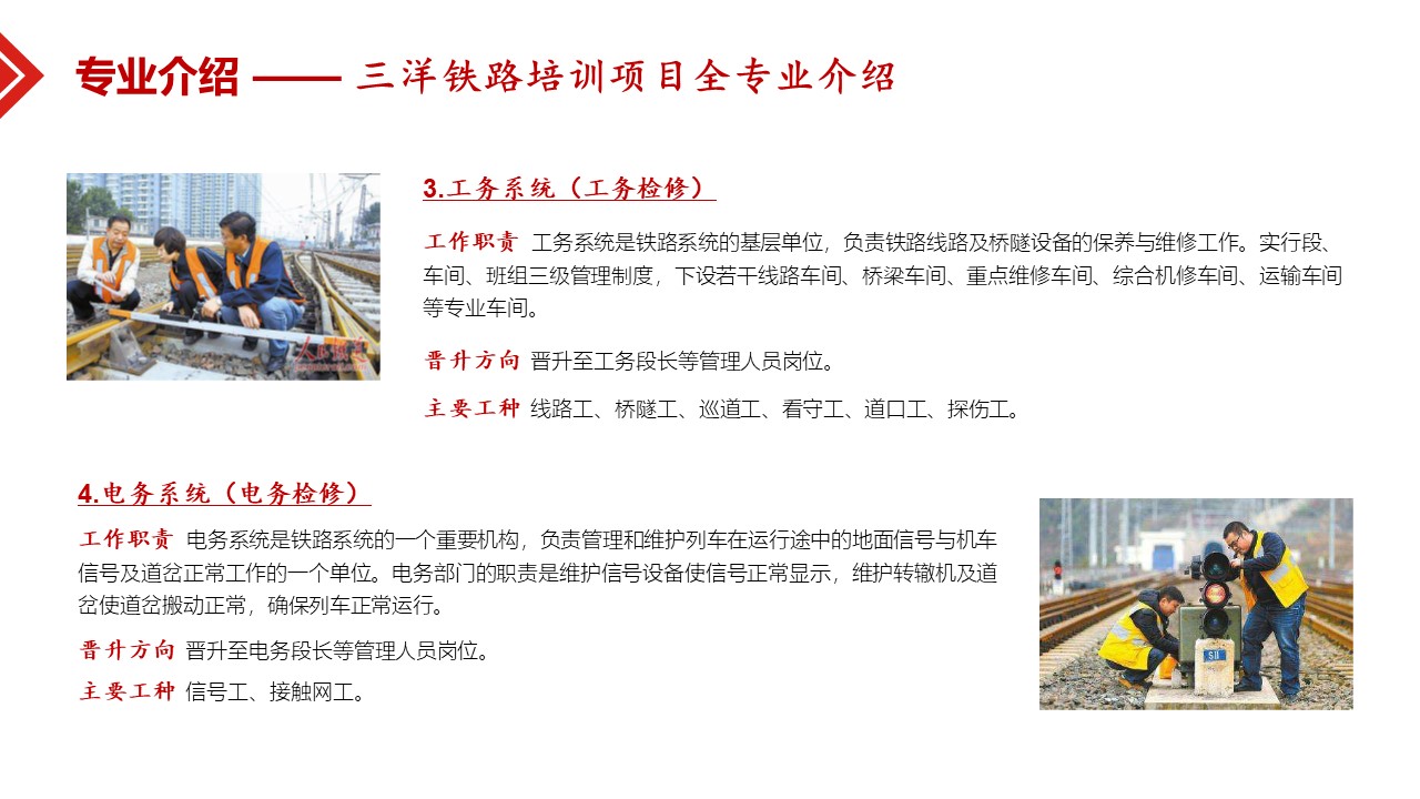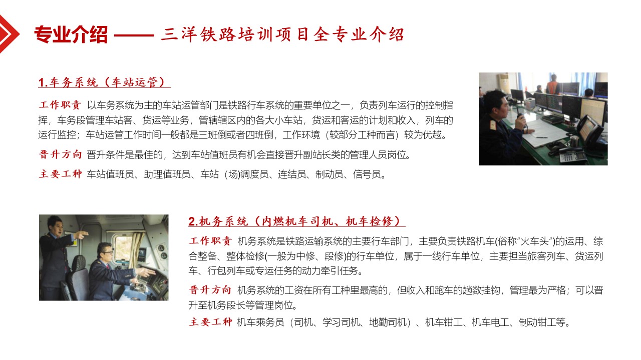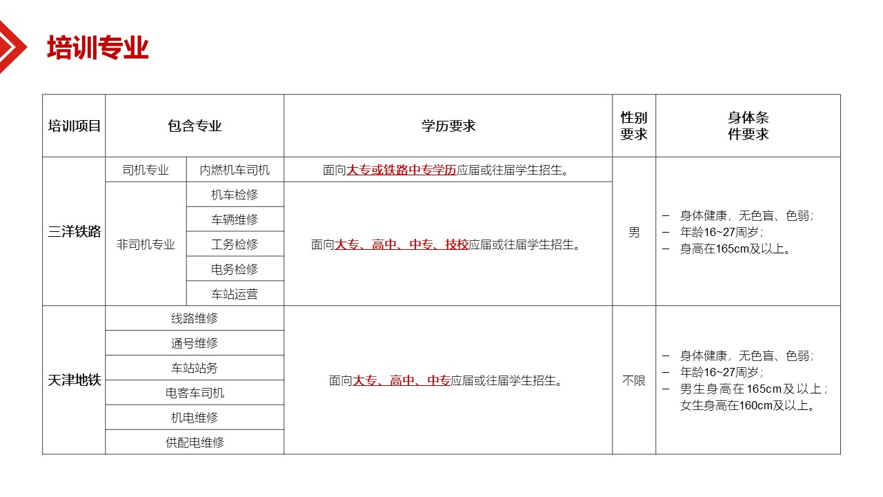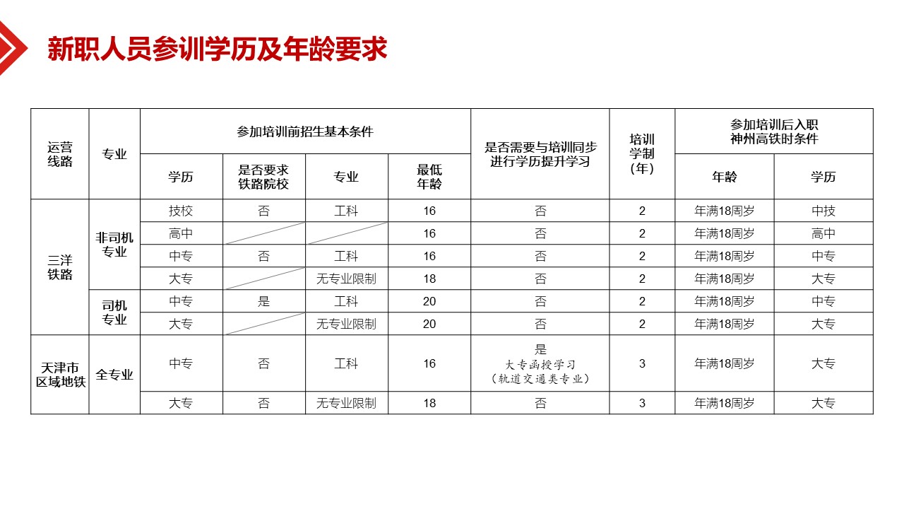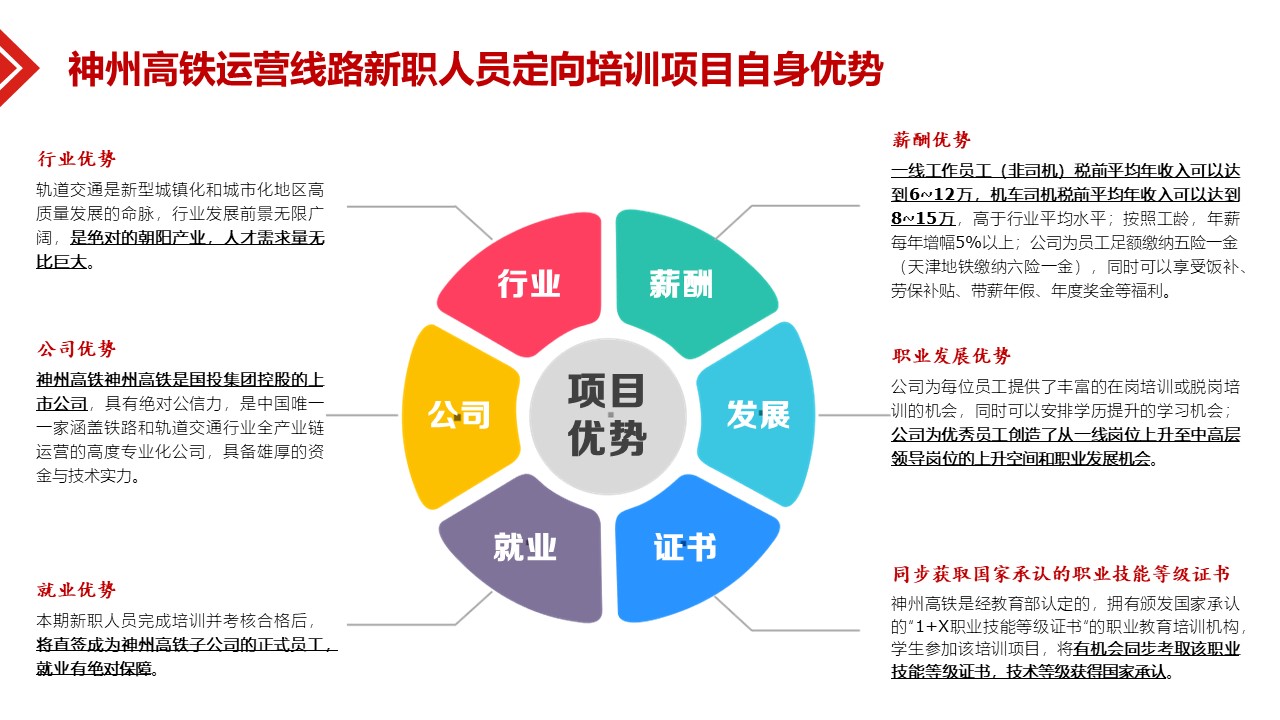 为满足三洋铁路和天津市区域城市轨道交通线路定向储备人才培养和后期用工的需求,神州高铁面向院校诚聘储备人才进行集中封闭式定向培养,学员培训结业考核合格后,签约神州高铁子公司正式员工,并统一分配至三洋铁路或天津城市轨道交通线路岗位一线从事专业工作,并获得国家承认的相关专业大专学历证书。