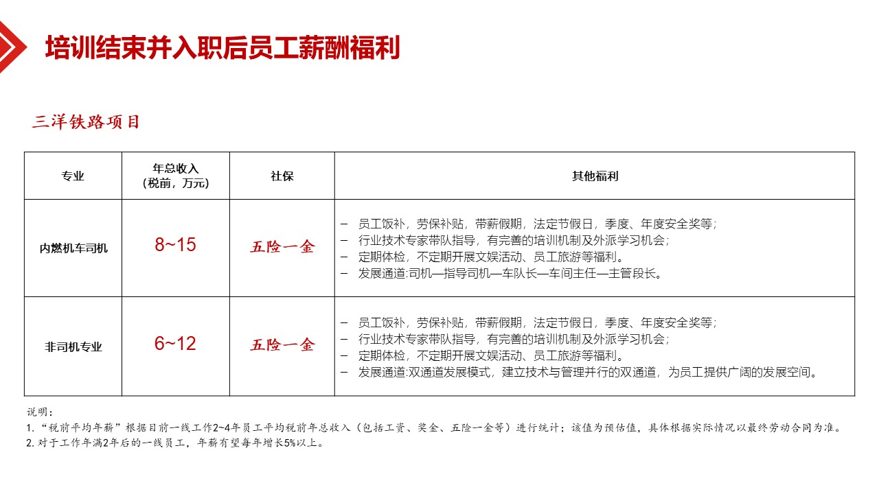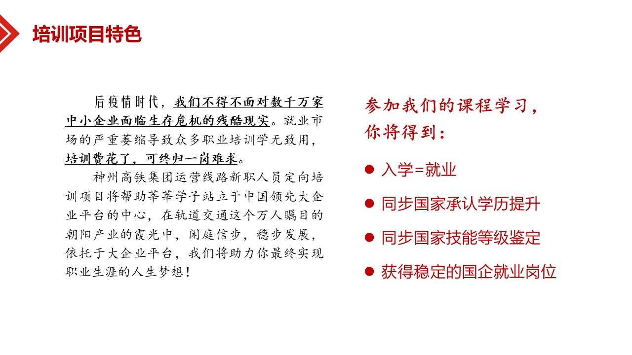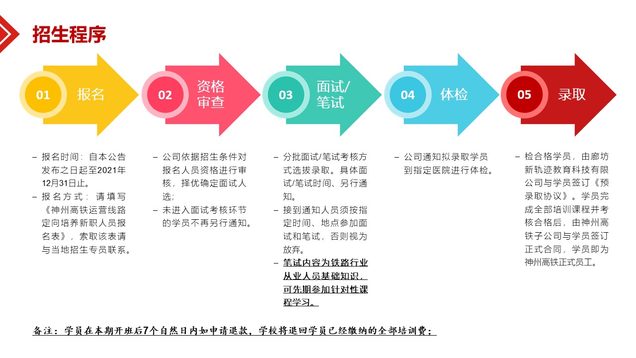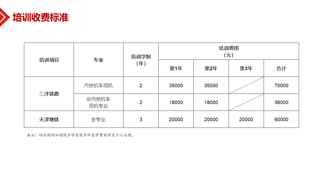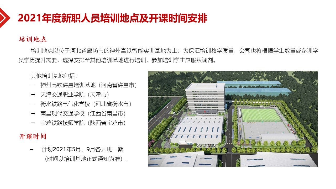 为满足三洋铁路和天津市区域城市轨道交通线路定向储备人才培养和后期用工的需求,神州高铁面向院校诚聘储备人才进行集中封闭式定向培养,学员培训结业考核合格后,签约神州高铁子公司正式员工,并统一分配至三洋铁路或天津城市轨道交通线路岗位一线从事专业工作,并获得国家承认的相关专业大专学历证书。