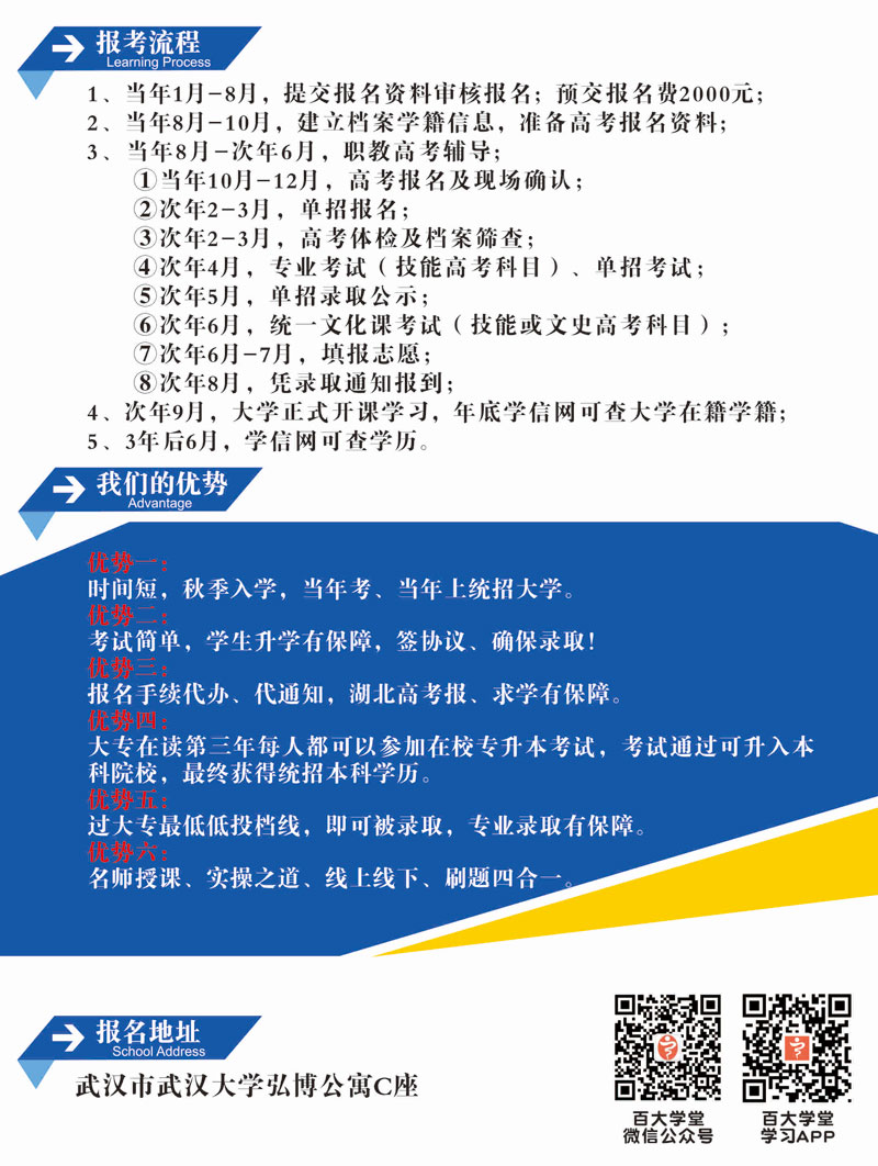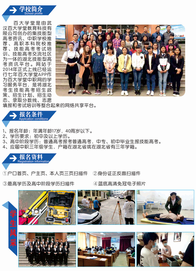 百大学堂专注湖北省技能高考升学培训,自2016年至今,已经开设6届技能高考培训班,为广大考生提供升学指导、生涯规划、升学培训等服务。是湖北地区有一定影响力的技能高考升学培训机构。目前主要培训的专业有:计算机、建筑、护理、旅游、会计、汽修、电子电气。