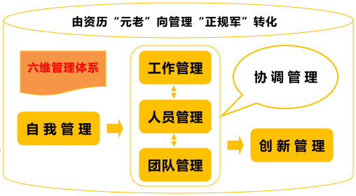 自我管理 | 管理转型:《管理者的格局突破与情商开发》 思维模式与格局修为; 管理者应具备的格局; 做事原则与执行方略; 目标使命与责任担当; 人际关系与沟通技巧; 职位权力与个人权力; 管理者影响力构成; 塑造中高层管理干部人格魅力。 | 管理能力:《中层管理干部十项管理技能提升》 科学管理思维塑造; 管理角色认知与定位 目标管理与工作控制; 授权与激励技巧; 部属培育与激发技巧; 高效沟通技巧;问题分析与解决; 高效时间管理;高效执行力; 领导力与影响力修炼。 |