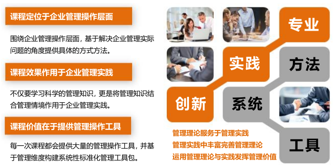 创新管理 | 思维创新变革:《创新思维与问题解决》 创新与创新思维; 如何提升个体创新能力; 如何提升企业管理协同创新能力; 打造企业创新文化执行力; 打造企业的创新制度执行力; 打造企业的创新管理执行力; 如何持续提升企业执行力。 | 产品创新管理:《产品创新与价值升级》 定用户,形成:《用户分析矩阵图》 挖需求,形成:《相关人需求地图》 做设计,形成:《产品原型设计》 设模式,形成:《产品创新画布》 设模式,形成:《产品增值设计原型》 定流程,形成《产品创新标准流程》 定制度,形成《产品创新管理制度》 |