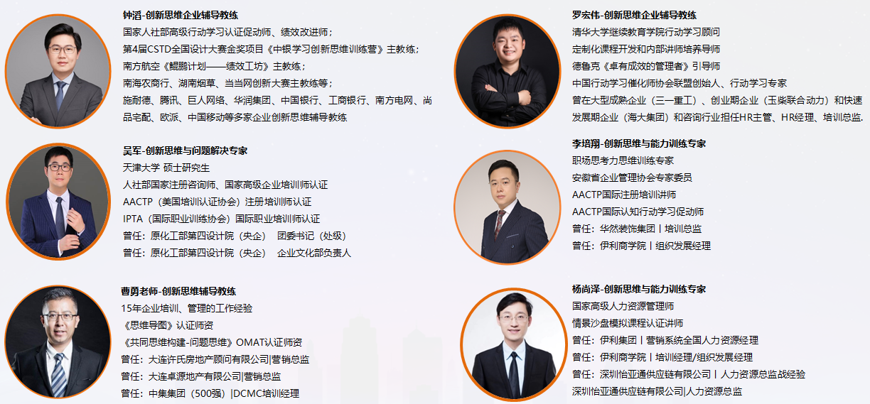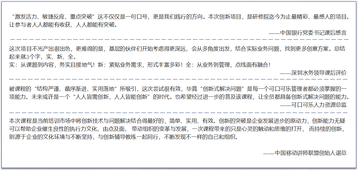 《创新思维与问题解决》 【项目价值】 1、降本增效:建立团队创新的流程、创新方法,创新工作模式改变思维,创造成果; 2、效果提升:通过创新思维训练及创新能力提升,改善管理效果,提升管理绩效; 3、能力提升:在多变环境中,管理干部能独立思考,快速找到管理解决方案。 4、适用企业:无行业限制,无岗位类别限制,可以基于受训对象的不同进行定制化设计,从而解决现实问题。 【项目对象】需要解决多重问题,不断创新改进的部门负责人;找寻创新战略的中高层管理者;企业创新项目、试验项目的技术骨干;需要转型或持续升级产品的产品经理 【项目模式】两种项目实施模式:一是培训模式,基于问题解决开展为期两天的课程培训;二是咨询模式,基于存在的实际问题进行整体解决思路设计,并全程辅导落地。 【课程模式】2天12小时,理论讲授(20%)+案例分析(30%)+小组研讨(20%)+实操练习(30%);基于问题解决与成果输出的实用性课程。