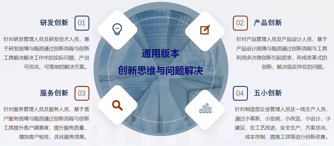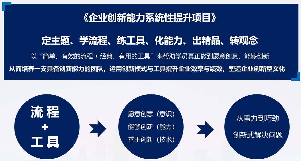 《企业创新能力系统性提升项目》基于通用版的创新思维与问题解决项目思路,立足于不同类型企业具体业务模块,从项目研发、生产制造、产品设计及服务优化四个方面,构建创新项目产品矩阵,并通过构建各个方面的创新流程,输出创新工具,解决现实难题,从而对工作绩效产生有效的促进作用。