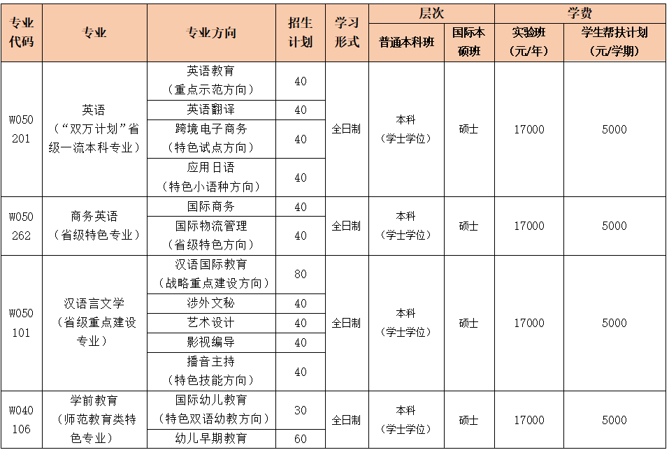 备注:1、普通本科学费:17000元/年(学生帮扶计划学费自缴5000元/学期),具体费用以入学须知为准。