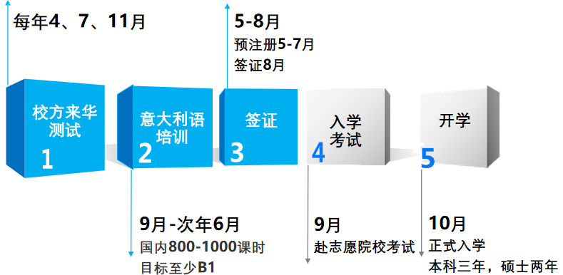 1. 每年9月份开启国内语言预科培训,达到意语B2等级 约600课时(国内语言400课时+国外200课时外教课)