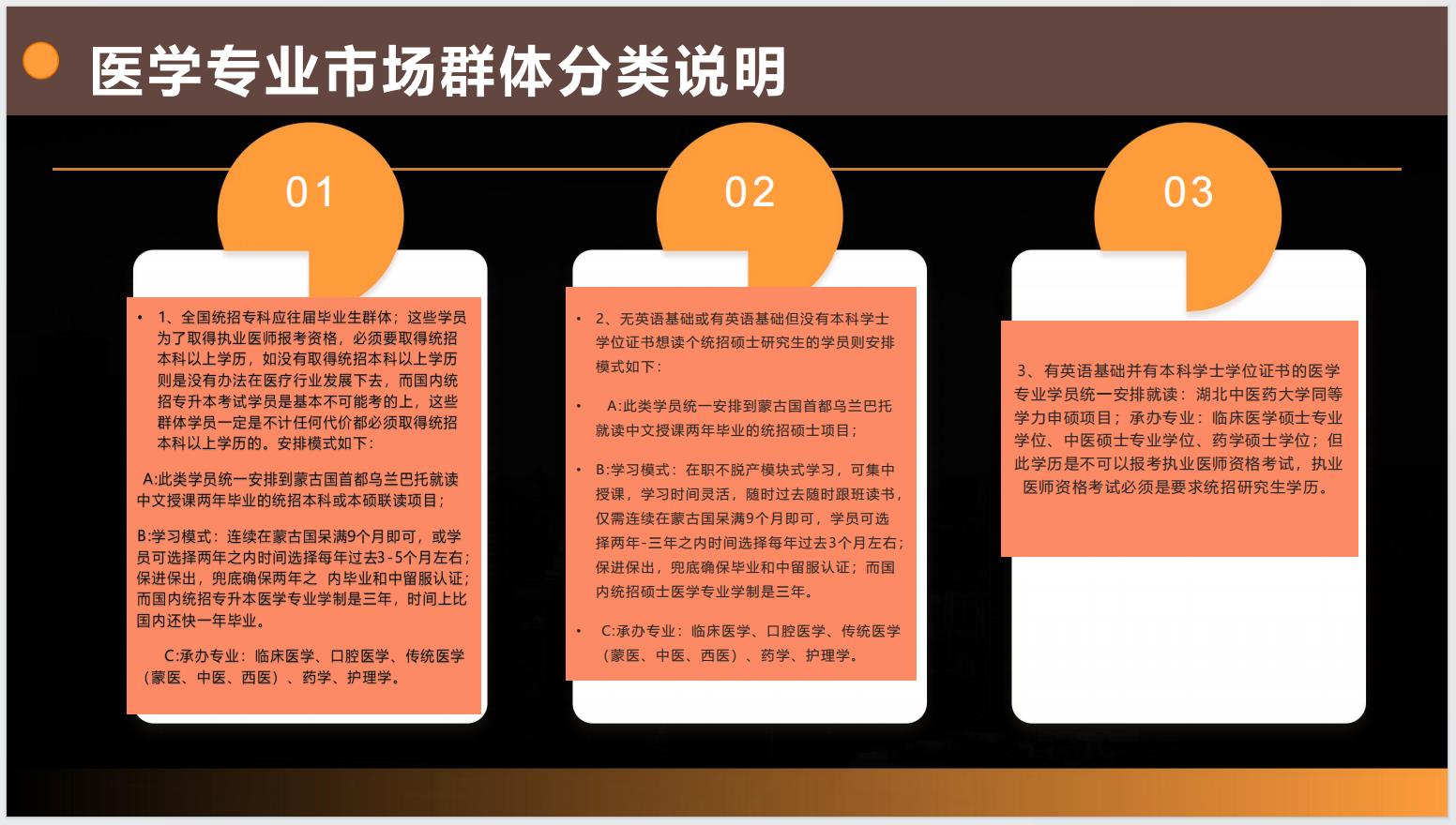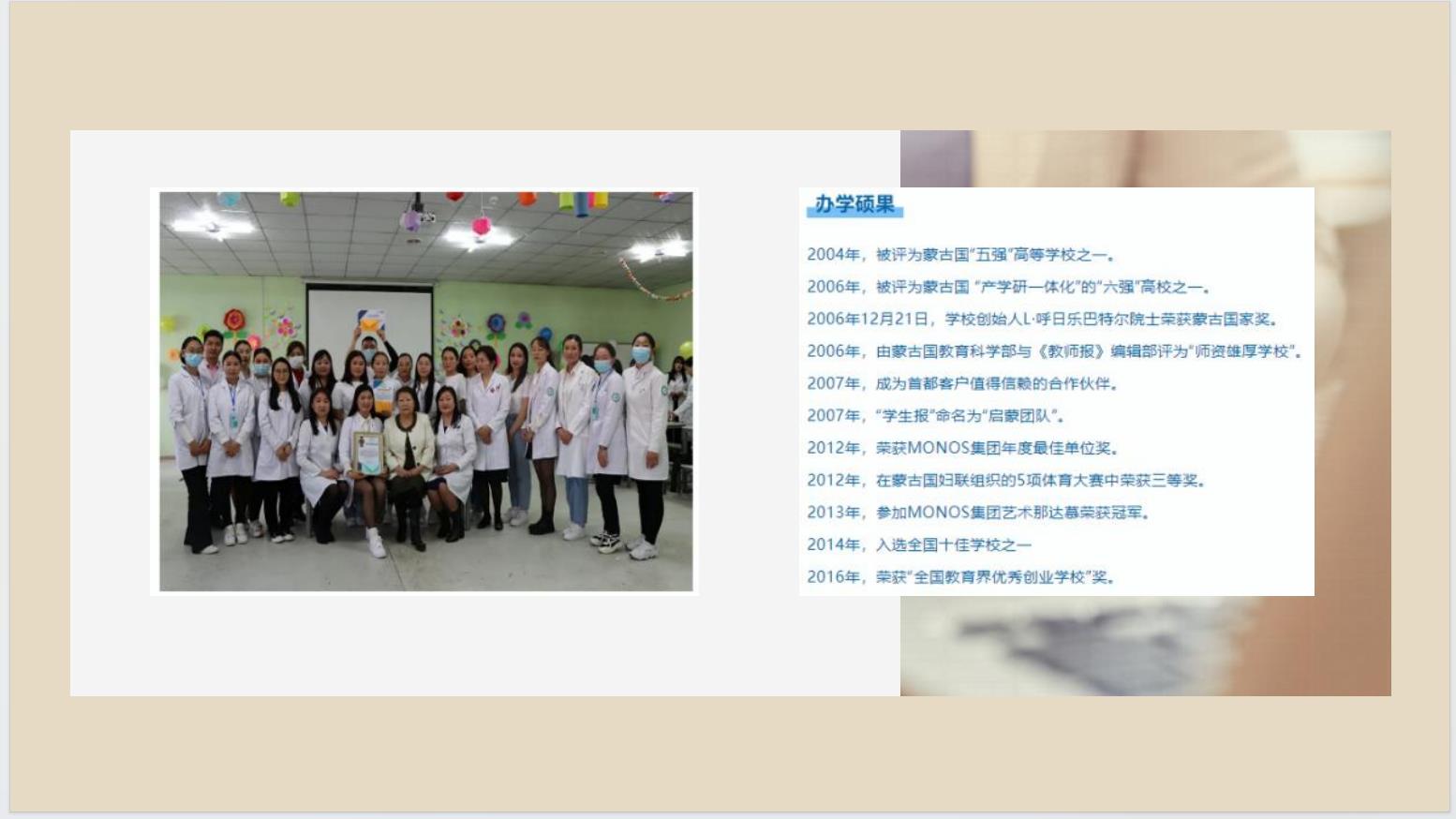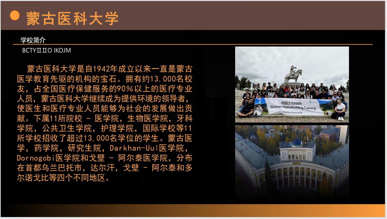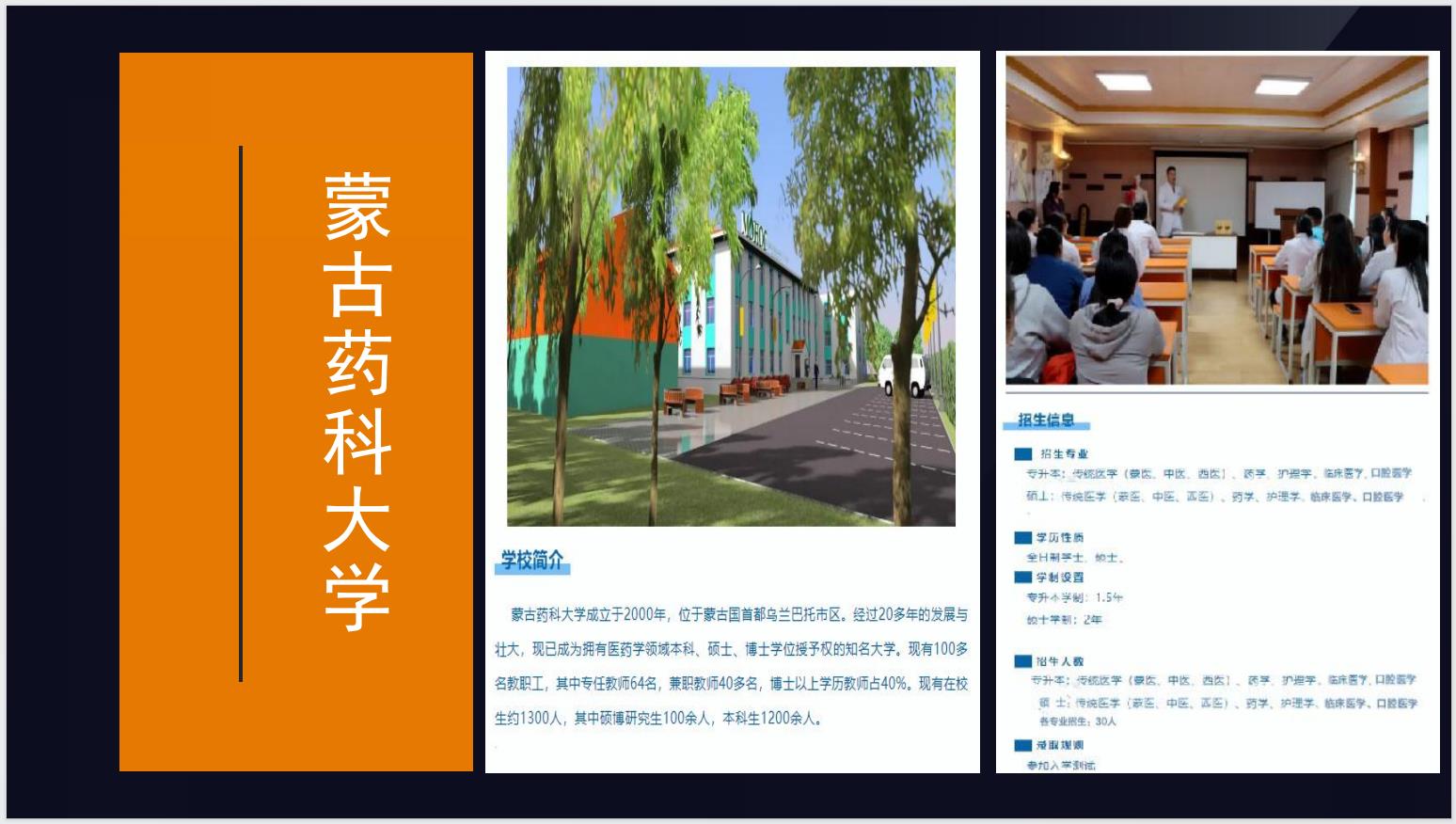 蒙古医科大学是自1942年成立以来一直是蒙古 医学教育先驱的机构的宝石。拥有约13, 000名校 友,占全国医疗保健服务的90%以上的医疗专业 人员,蒙古医科大学继续成为提供环境的领导者, 使医生和医疗专业人员能够为社会的发展做出贡 献。下属11所院校-医学院,生物医学院,牙科 学院,公共卫生学院,护理学院,国际学校等11 所学校招收了超过13, 000名学位的学生。蒙古医 学,药学院,研究生院,Darkhan-Uul医学院, Dornogob i医学院和戈壁一阿尔泰医学院,分布 在首都乌兰巴托市,达尔汗,戈壁 阿尔泰和多 尔诺戈比等四个不同地区。