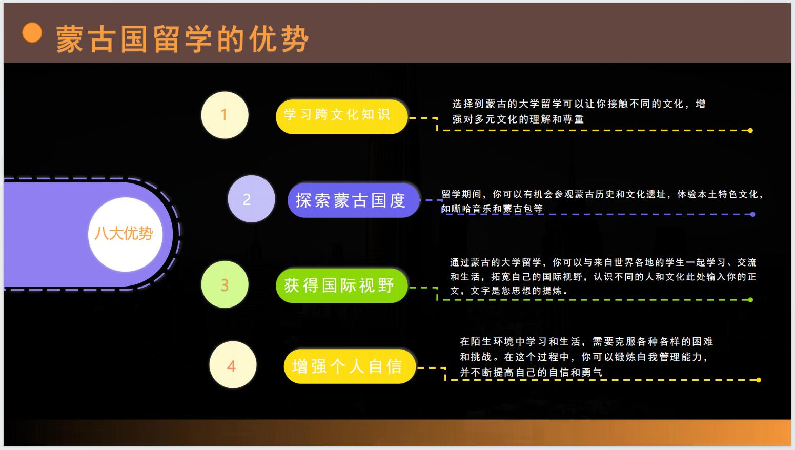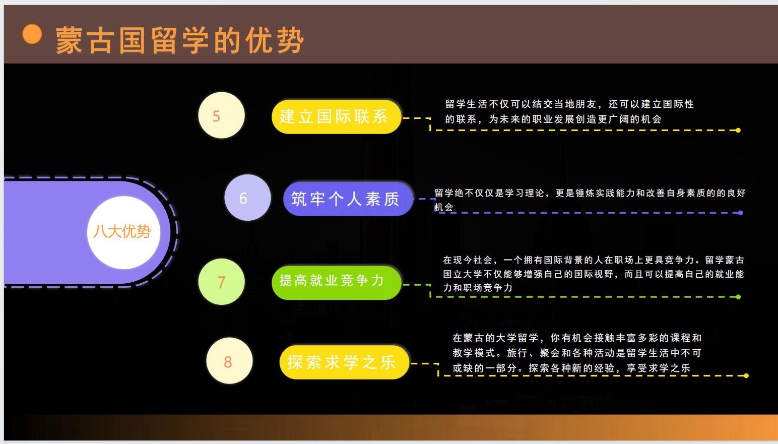通过蒙古的大学留学,你可以与来自世界各地的学生一起学习、交流和生活,拓宽自己的国际视野,认识不同的人和文化此处输入你的正文,文字是您思想的提炼。